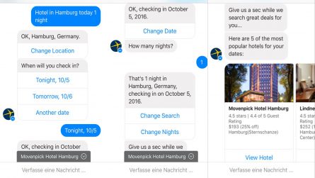 Das Beispiel zeigt eine Konversation mit dem Expedia-Chatbot für eine Hotelsuche. Gleiches funktioniert auch bei Kayak für die Suche nach Flügen.
